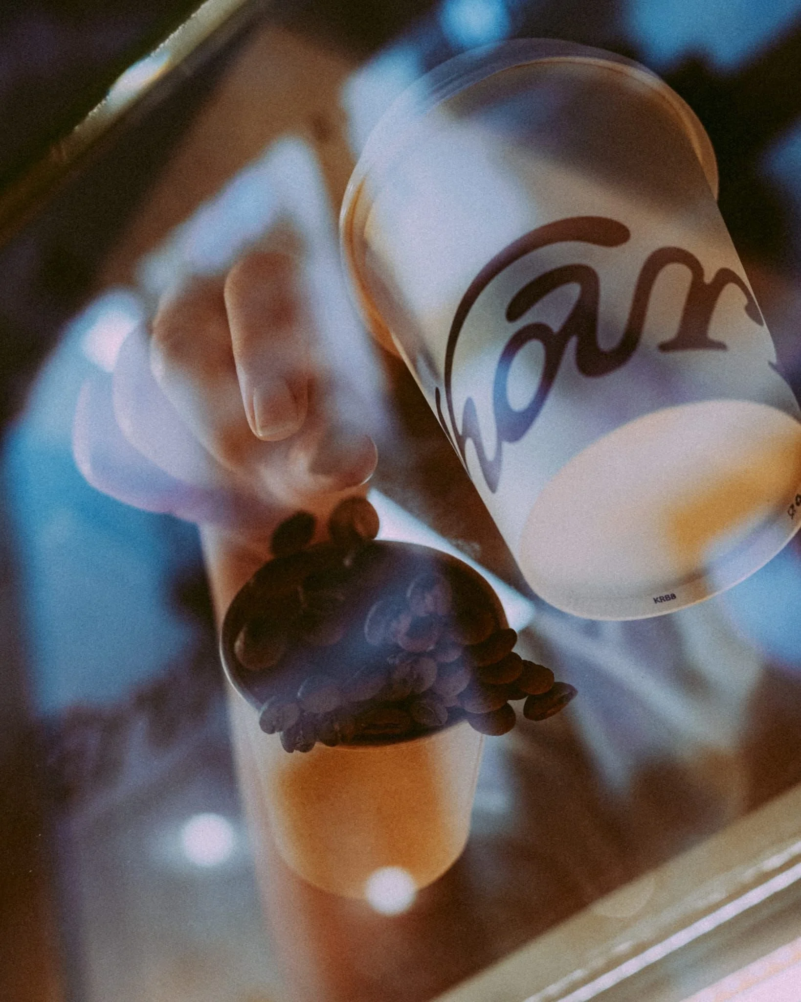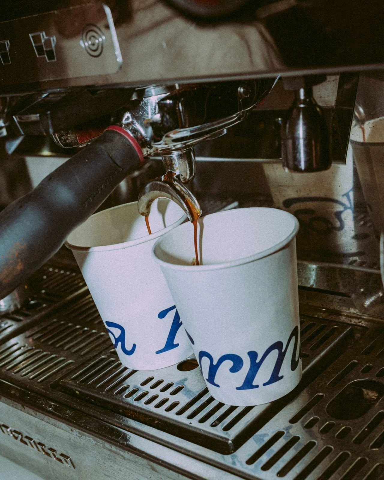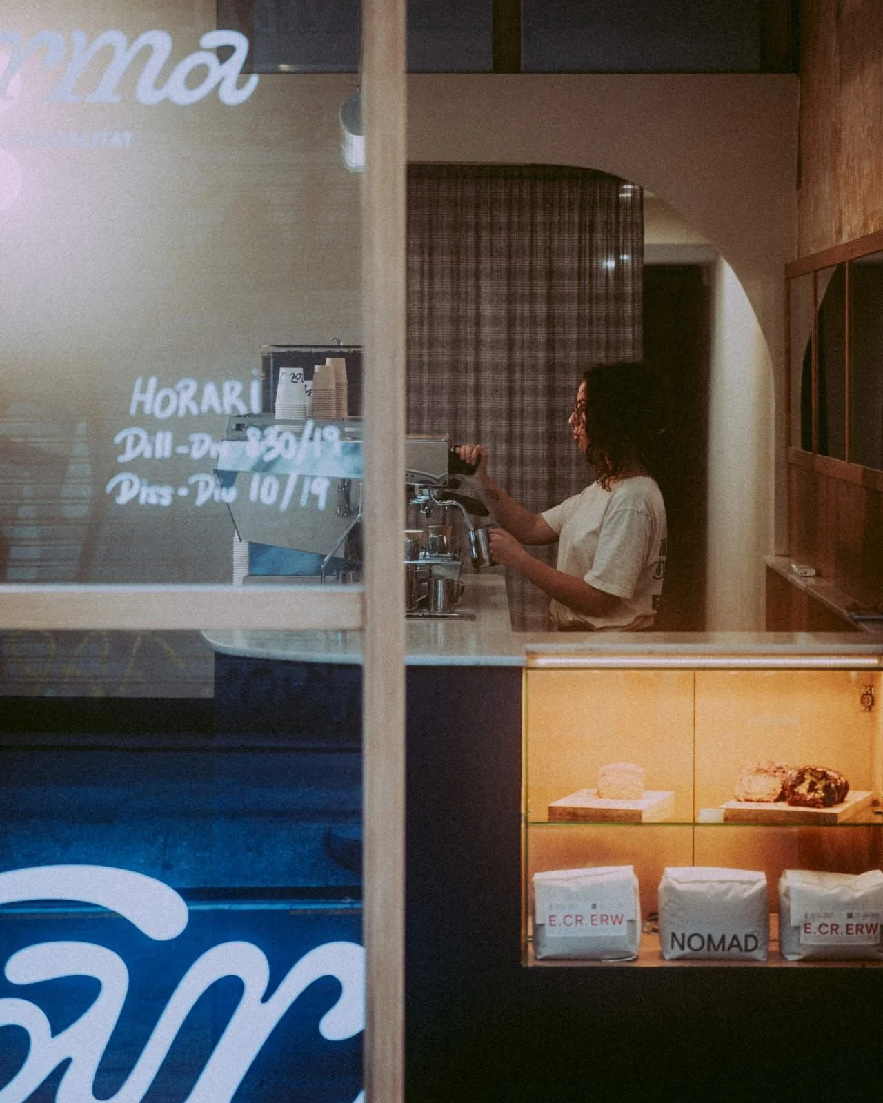 Logo design for a small, specialized coffee shop in El Raval, a vibrant neighborhood in the heart of Barcelona. The logo was custom-drawn to evoke fluidity and movement, inspired by vintage typography, particularly Bookman Swash. Some of the logo applications included glass decals, coffee cups, and employee t-shirts, among others.