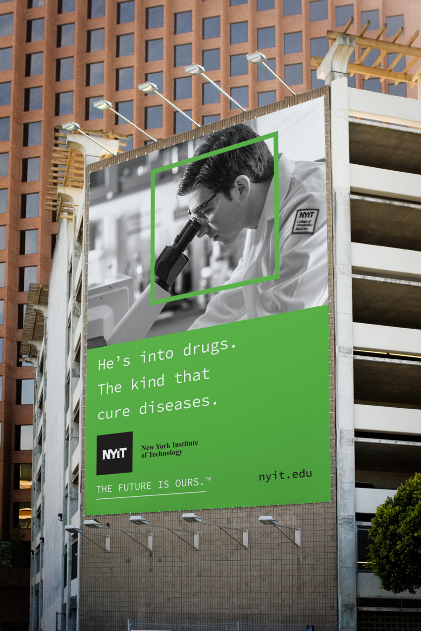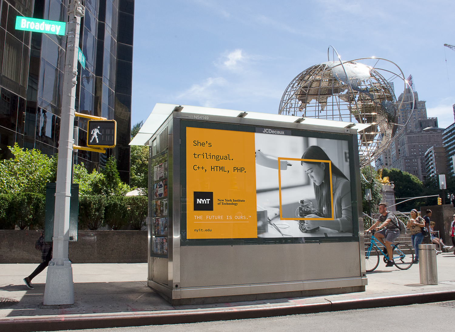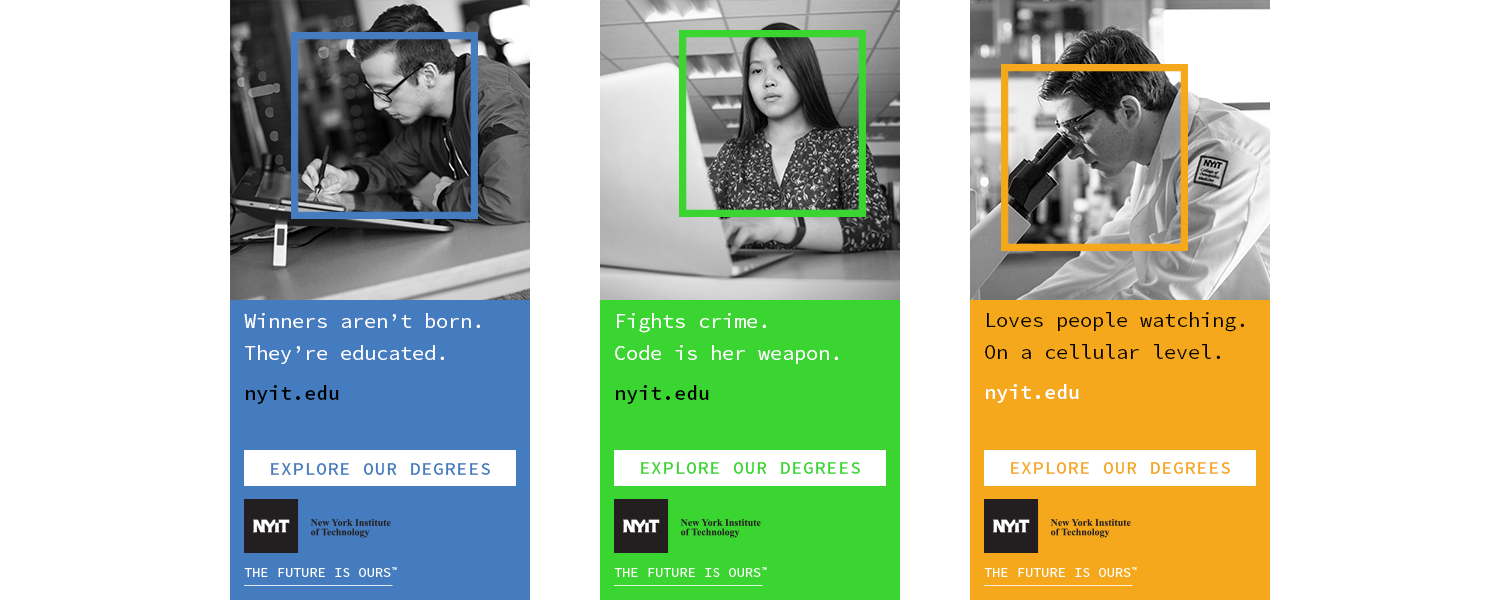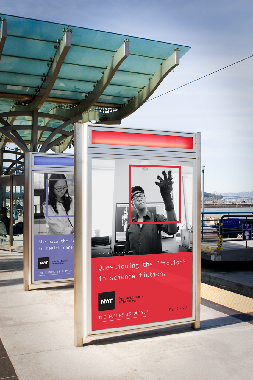 A 360° campaign featuring real students and situations, paired with compelling headlines. The ads I designed were placed in environments where prospective students would feel recognized and see NYIT as a place to help shape the future.