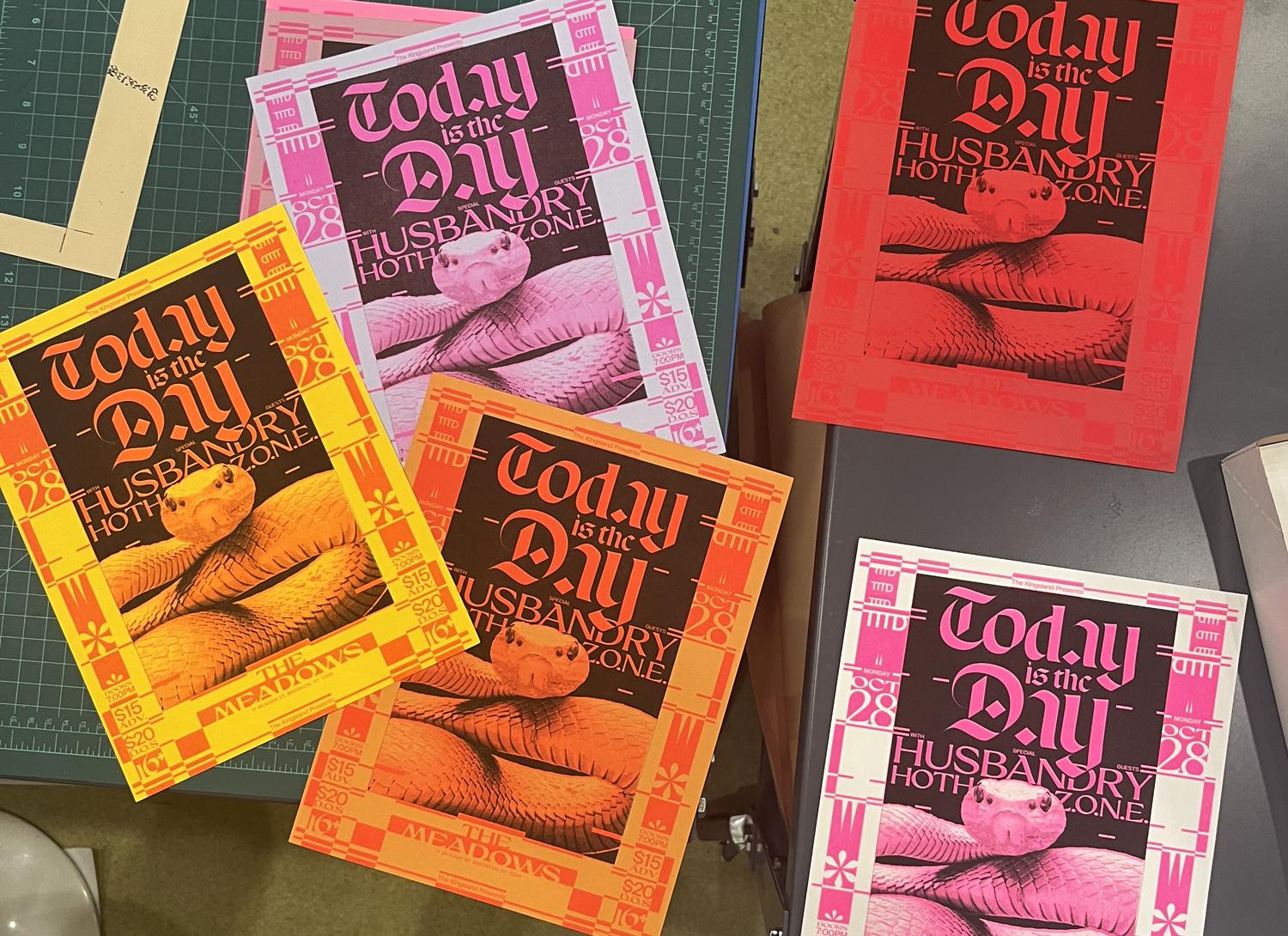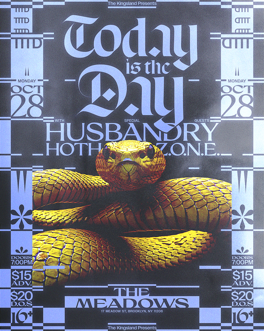 Poster designs for Today Is The Day with Husbandry, Hoth, and Z.O.N.E. The pit viper snake is a nod to TITD’s debut album Supernova (1993). Two poster versions were created for digital promotion, while a limited run of 25 risograph prints were sold at the event. The prints were 8.5”x11” posters on heavy stock, printed at Secret Riso Club, just around the corner from my apartment in Bushwick. Typefaces used include Respira Black by Sharp Type, Coconat by Collletttivo, and Owners by MCKL. Original photo by Agus Fitriyanto.