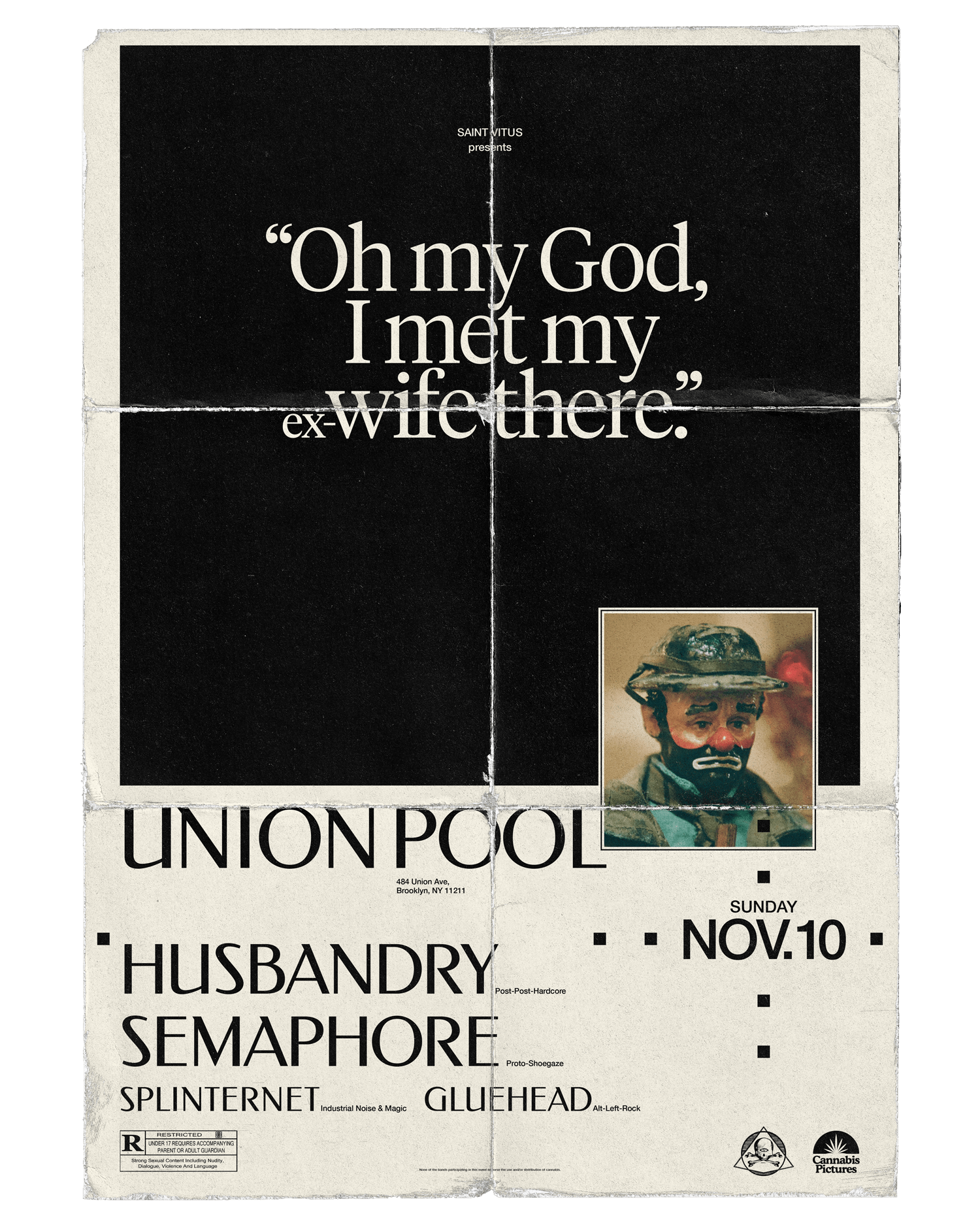 Poster design for Husbandry, Semaphore, Splinternet, and Gluehead at Union Pool in Brooklyn. The concept reimagines the original Hardcore (Paul Schrader, 1979) movie poster, incorporating a quote that humorously references the venue’s past. The quote is aimed at nostalgic, mostly elder millennials who frequented Union Pool a decade ago, when it was known as a popular pick-up spot. The poster also includes several other humorous Easter eggs in the form of small captions and graphics.